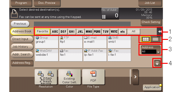 2 | Switches the display of the registered destinations to the button or list view mode. If the list view mode is selected, you can sort destinations by registration number, destination type, or registered name. |