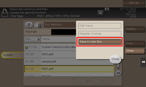 You can also print files by selecting the User Box mode and by tapping [System] - [External Memory].