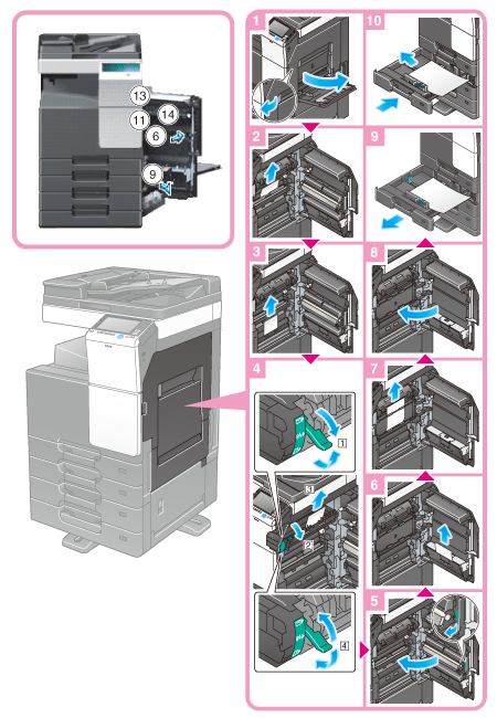 Take out the paper tray (Tray 1/2) and pull out the paper tray (Tray 3/4), then remove pieces of paper.