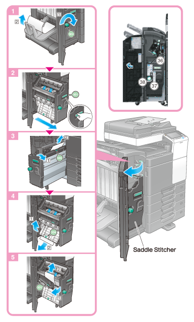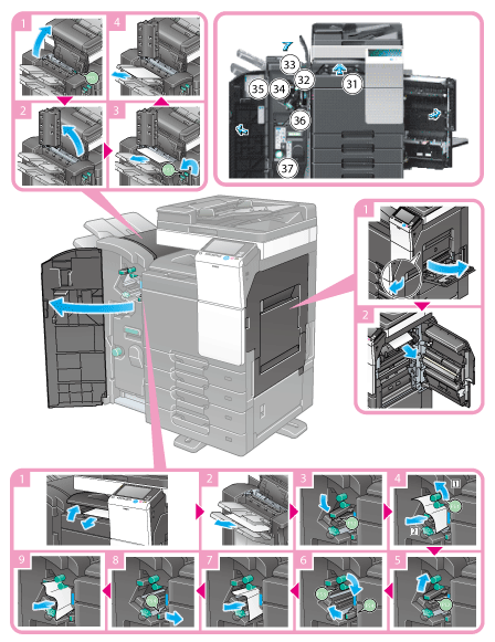 Sections inside the finisher prone to paper jams vary depending on the settings for [Finishing].