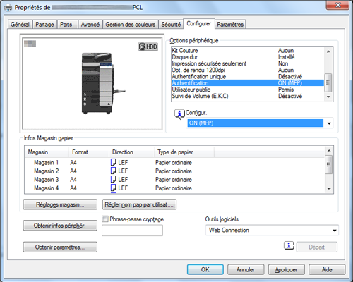 Si communication OpenAPI est chiffré par SSL et que les informations sur le périphérique peuvent être automatiquement obtenus depuis le pilote d'imprimante, la phrase-code de cryptage peut être obtenue de la part de cette machine. Pour des détails sur la procédure de cryptage des communications OpenAPI avec SSL, voir Ici.