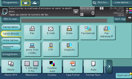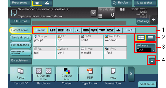 Dans [Histor. tâches], sélectionnez une destination dans l'historique des destinations d'émissions de données numérisées ou de destinations enregistrées.