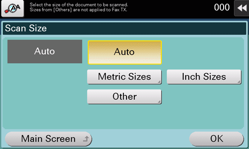 [Inch Sizes (Dim. pouces)] | Sélectionnez cette option pour numériser un original au format en pouces. Tapez sur [Dim. pouces] et sélectionnez un format en pouces standard. |