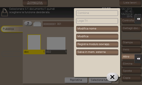 Selezionare un file, quindi premere [Altro] - [Salva documento nella cart. condivisa MFP]. A questo punto si possono registrare i file salvati nella Casella utente pubblica in una cartella condivisa SMB.