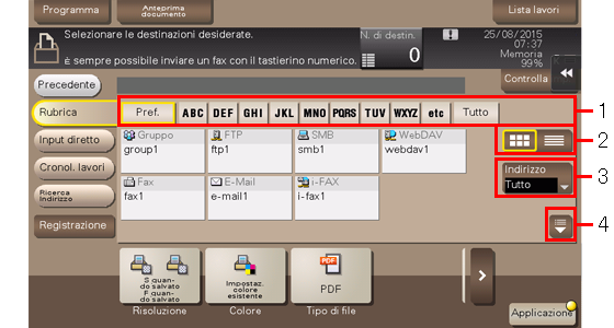 2 | Cambia la visualizzazione delle destinazioni registrate, passando alla modalità pulsante o vista elenco. Se è stata selezionata la modalità vista elenco, è possibile ordinare le destinazioni in base al numero di registrazione, tipo di registrazione o nome registrato. |