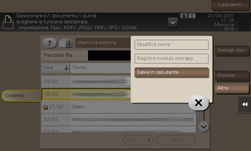 È inoltre possibile stampare i file selezionando il modo casella utente e premendo [Sistema] - [Memoria esterna].