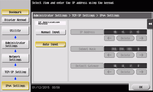 Nel Pannello di controllo, fare clic su [Utilità] - [Impostazioni Amministratore] - [Impostaz. rete] - [Imp. TCP/IP] - [Impostaz. IPv4], quindi configurare la seguente impostazione.