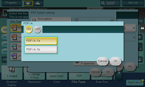 [ON]/[OFF] | Selezionare [ON] per creare un file PDF basato su PDF/A. |