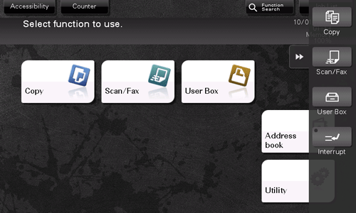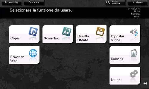 Il menu cursione fornisce tasti funzione per passare alla schermata di copia o di scansione. I tasti funzione da visualizzare nel menu cursione possono essere modificati e adattati al proprio ambiente di lavoro.