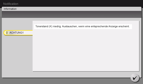 Wenn der Austausch einer Tonerkartusche unmittelbar bevorsteht, wird eine erweiterte Warnmeldung angezeigt. Halten Sie eine Tonerkartusche für Austauschzwecke gemäß Wartungsvertrag bereit.