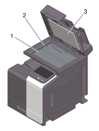 2 | Alimentatore dei documenti automatico (ADF) | Alimenta ed esegue automaticamente la scansione degli originali per pagina. Quest'unità è in grado di scansionare un originale di 2 lati inserendo la carta una sola volta nella macchina senza bisogno di capovolgerla. Nel manuale, questa unità è denominata ADF. |