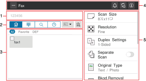 4 | Icona del menu ( | È possibile registrare l'impostazione corrente come preferita e richiamarla, oppure cambiare la modalità di visualizzazione dell'elenco delle destinazioni registrate nell'area di specificazione della destinazione. È inoltre possibile ordinare le voci di impostazione delle opzioni per l'invio o modificare l'impostazione predefinita per l'invio con quella desiderata. Per informazioni dettagliate, fare riferimento a Schermata di impostazione in ciascuna modalità. |