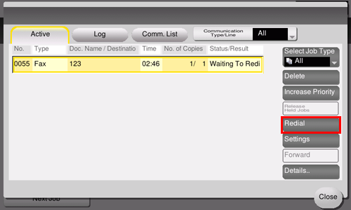 Un tentativo di trasmissione fax non riuscito viene gestito come un lavoro riservato in attesa di reinvio (richiamata).