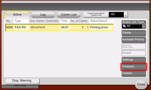 Se non è possibile risolvere il problema tempestivamente, il fax salvato può essere inoltrato a un'altra destinazione.