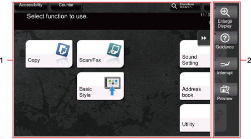 2 | Menu cursione | Visualizza i tasti assegnati a ciascuna funzione. È possibile selezionare [Utilità] - [Amministrat.] - [Impostazioni di sistema] - [Impostazioni tasto registrato] per modificare le funzioni da assegnare al menu cursione. |