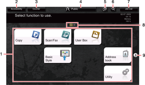 5 | [Lingua] | Modifica temporaneamente la lingua di visualizzazione del pannello. Questa opzione viene visualizzata quando [Modifica lingua temporanea] è impostato su ON in [Utilità] - [Amministrat.] - [Impostazioni di sistema] - [Modifica lingua temporanea]. |