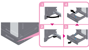 Rilasciare il blocco come mostrato in figura, tirare fuori il vassoio carta, quindi rimuovere tutti i pezzi di carta inutili.