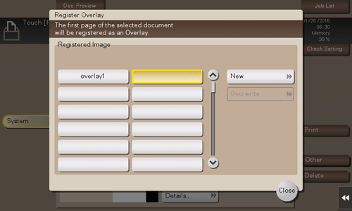 Stores file as an overlay image. Once registered, you can compose an overlay image on the original during copying or printing.