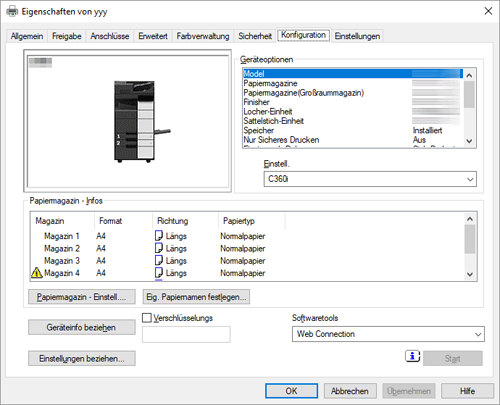 Wenn die OpenAPI-Kommunikation per SSL verschlüsselt ist und die Geräteinformationen automatisch vom Druckertreiber abgefragt werden können, kann das Verschlüsselungskennwort von diesem System abgerufen werden. Ausführliche Informationen zur Verschlüsselung der OpenAPI-Kommunikation per SSL finden Sie Hier.