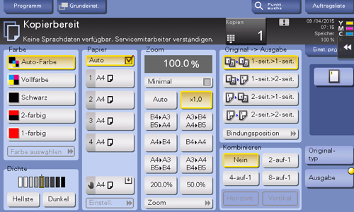 Sie können auf [Schnellkop.] im Hauptbildschirm des Kopiermodus des klassischen Stils tippen, um die grundlegenden Kopiereinstellungen in einem einzigen Bildschirm anzuzeigen. Diese Funktion ist nützlich, wenn Sie Grundeinstellungen gemeinsam konfigurieren möchten.