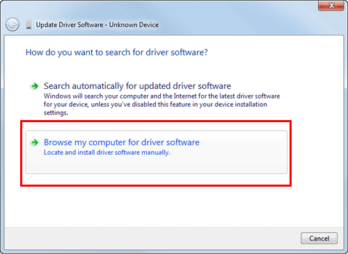 In dem Bildschirm, in dem auszuwählen ist, wie nach der Treibersoftware gesucht werden soll, klicken Sie auf [Auf dem Computer nach Treibersoftware suchen].