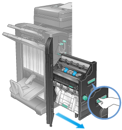 Fassen Sie den Broschürenfinisher beim Herausziehen nur am Griff an. Andernfalls könnten Sie mit Ihrer Hand oder einem Finger im System hängen bleiben.