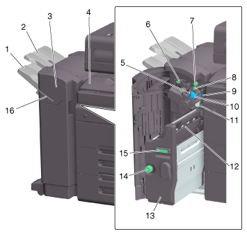13 | Broschürenfinisher | Ziehen Sie diese Einheit zum Beheben eines Papierstaus oder Heftklammerstaus oder zum Austauschen eines Heftklammermagazins heraus. |