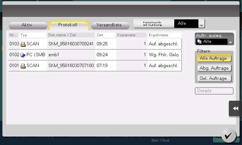 Sie können die Anzeige der Protokolle mit [Auftr. auswähl.] oder [Filtern einschränken].
