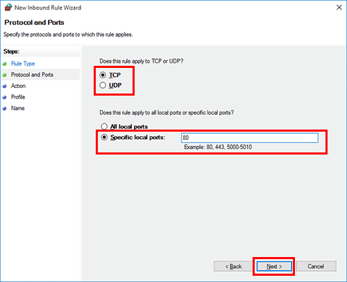 Wählen Sie ein Protokoll aus, geben Sie die Portnummer in [Bestimmte lokale Ports] ein und klicken Sie auf [Weiter].