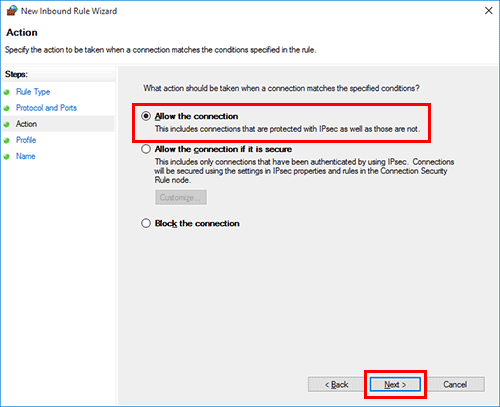 Vergewissern Sie sich, dass [Verbindung zulassen] ausgewählt ist, und klicken Sie auf [Weiter].