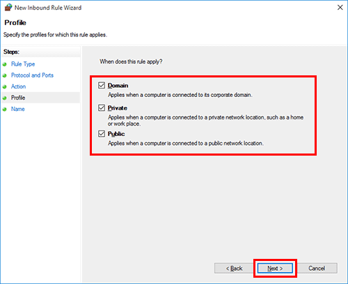 Aktivieren Sie die Kontrollkästchen für die Profile, die der Umgebung für die Nutzung dieses Systems entsprechen, und klicken Sie auf [Weiter].