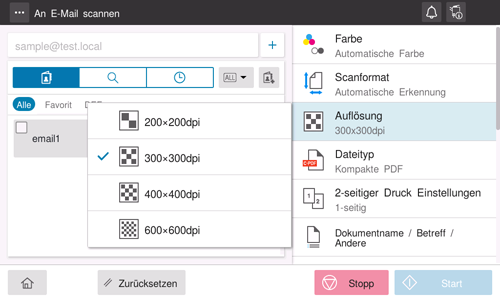 Geben Sie einfach eine E-Mail-Adresse als Ziel an. Sie können die Daten dann als Anhang senden. Ausführliche Informationen über die E-Mail-Übertragungsfunktion finden Sie Hier.