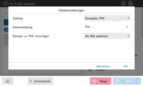Ändern Sie den Einstellungswert von [Dateityp] zu dem standardmäßig verwendeten Dateityp im Scan-Bildschirm und wählen Sie [Aktuellen Einstellungswert auf Standardwert setzen] über das Menüsymbol.