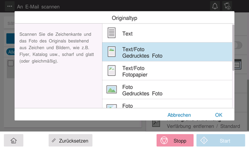 Wählen Sie [Originaltyp] und wählen Sie dann die zu den Inhalten des zu scannenden Originals passende Bildqualität aus.