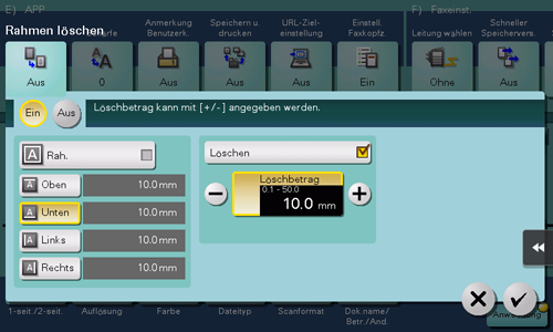 Um für jede Kante eine individuelle Löschbreite anzugeben, tippen Sie zunächst auf [Rahmen], um das Kontrollkästchen zu deaktivieren. Wählen Sie dann die gewünschte Seite aus und geben Sie die Löschbreite an.