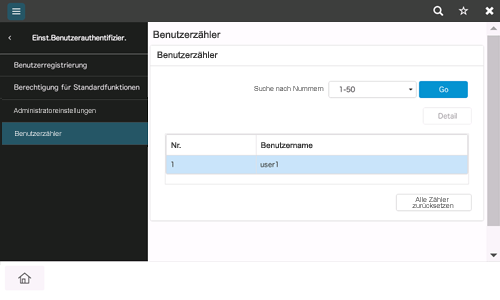 Um die Zähler für alle Benutzer zurückzusetzen, tippen Sie auf Alle [Zähler zurücksetzen], wählen Sie [Ja] aus und tippen Sie dann auf [OK].
