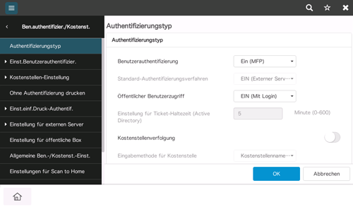 Wählen Sie [Öffentlicher Benutzerzugriff], und anschließend [EIN (Mit Login)] oder [EIN (Ohne Login)] aus und tippen Sie auf [OK].