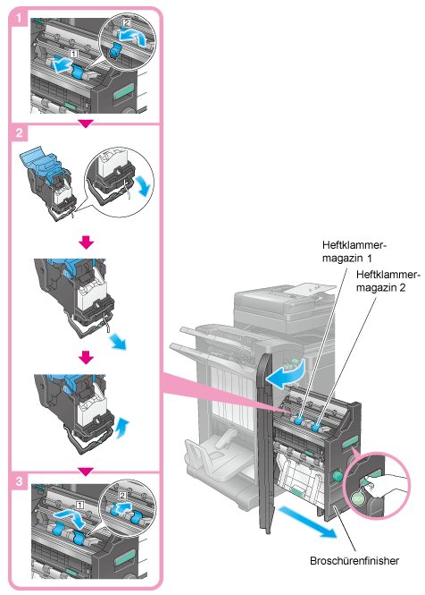 Fassen Sie den Broschürenfinisher beim Herausziehen nur am Griff an. Andernfalls könnten Sie mit Ihrer Hand oder einem Finger im System hängen bleiben.