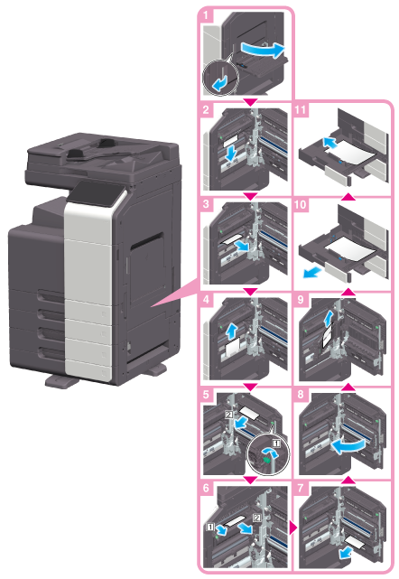 When removing pieces of paper in the paper tray (Tray 1/2)