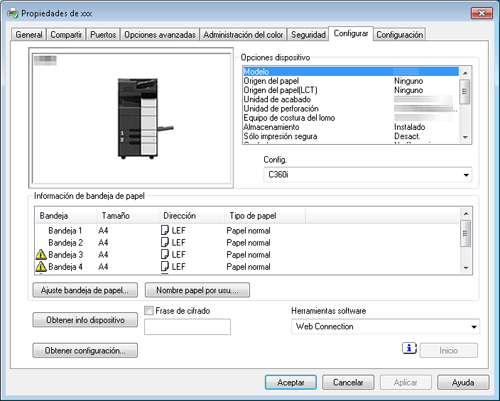 [Obtener info dispositivo] | El ordenador se comunica con esta máquina y obtiene información de instalación de los dispositivos opcionales. En [Obtener configuración...], defina el método para obtener la información de esta máquina. | |