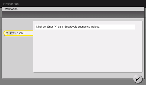 Cuando se acerque el momento de reemplazar un cartucho de tóner, aparece previamente un mensaje de aviso. Prepárese para reemplazar el cartucho de tóner según el contrato de mantenimiento.