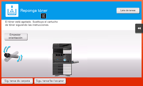 Cuando llega el momento de cambiar el cartucho de tóner, aparece un mensaje solicitando que se reemplace. Realice la sustitución de acuerdo con el contrato de mantenimiento. Toque [Empezar orientación] para consultar el procedimiento de reemplazo en la pantalla y revíselo.