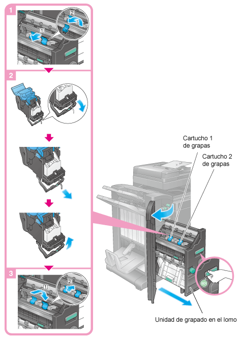 Cuando mueva la unidad de grapado en el lomo, sujétela solo por su asa. De lo contrario, la mano o los dedos pueden quedar atrapados en la máquina.