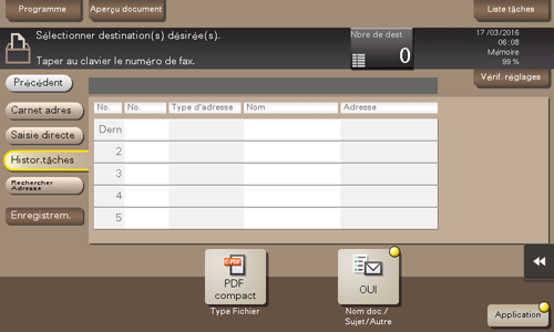 Spécifiez la destination cible parmi les cinq précédents historiques de tâches.