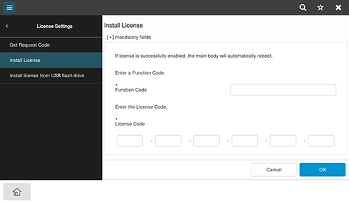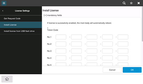 Cette machine établit une communication avec le LMS et active la fonction avancée gérée par le code de jeton. Lorsque les étapes d'enregistrement de licence et d'activation de fonctions sont terminées, généralement la machine redémarre automatiquement.