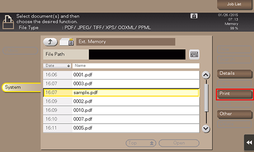 Vous pouvez également effectuer la même opération en appuyant sur [Système] - [Mémoire externe] en mode boîte utilisateur.