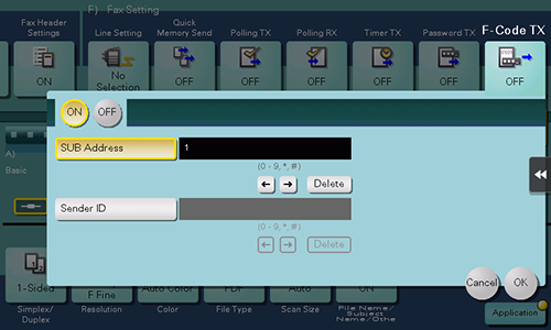 Appuyez sur [Application] - [Régl. fax] - [Fonction TX code F], et appuyez sur [OUI].