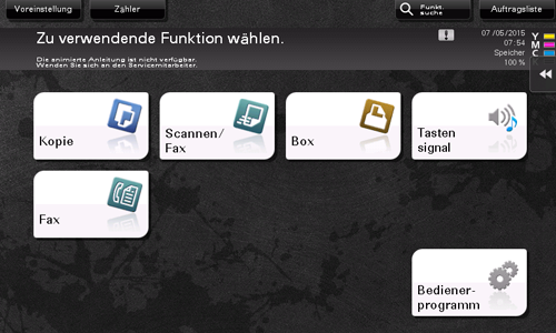 Binden Sie für die Verwendung des Faxmodus die Direktaufruftaste [Fax] im Hauptmenü ein. Ausführliche Informationen über die Einbindung einer Direktaufruftaste im Hauptmenü finden Sie Hier.