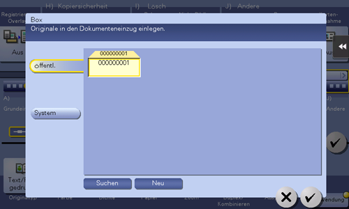 Wenn Sie das Original in einer öffentlichen Box, persönlichen Box oder Gruppenbox speichern möchten, tippen Sie auf [Öffentl.], [Privat] oder [Gruppieren] und wählen Sie die Zielbox aus. Tippen Sie auf [Neu] und geben Sie eine neue Boxnummer ein, um die Zielbox zu registrieren.