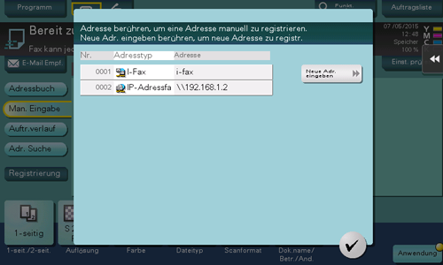 Nach Abschluss einer Faxübertragung an die manuell eingegebene Adresse tippen Sie auf [Adressbuch] und prüfen Sie, ob das Ziel registriert wurde.